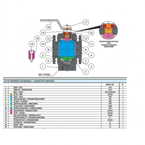 | Guľa (DN 15 – DN 20) | Nehrdzavejúca oceľ AISI 316 |