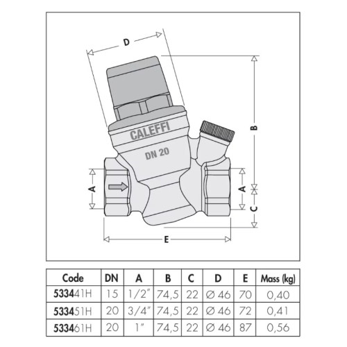 Caleffi 5334H Regulátor tlaku vody 1/2" Rozsah 1 - 5,5 BAR, Tmax 80°C