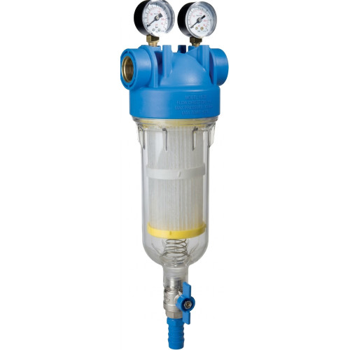 Balenie obsahuje: Telo filtra HYDRA M, 2x radiálny manometer (0-12 bar), filtračná vložka RSH 50 mcr a odtokový lievik so systémom proti spätnému toku.