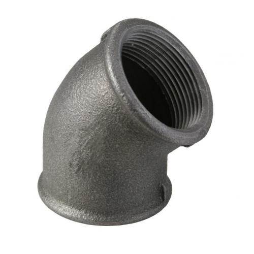Závitová armatúra z tvrdenej liatiny, typ – 45° d kolená armatúra s vnútorným potrubným závitom, čierna povrchová úprava. Vnútorné závity Rc sú kužeľové pre závitové spoje v súlade s normou ISO 7-1.